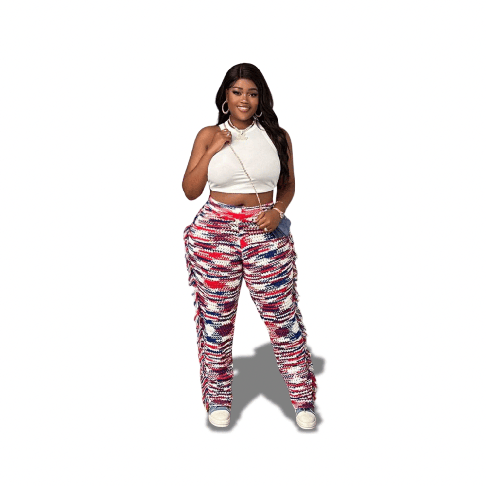 Handcrafted with a bold crochet design in Buffalo Bills team colors, these pants feature a flattering high-waisted fit and eye-catching fringe detail for a playful, boho-chic vibe.