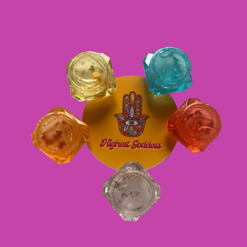 Made with 25mg of CBD, vegan TKB Lip Gloss Base & organic flavoring, each gemstone container is hand-crafted with sensual scents and charged with Highest Goddess Vibes just for you!